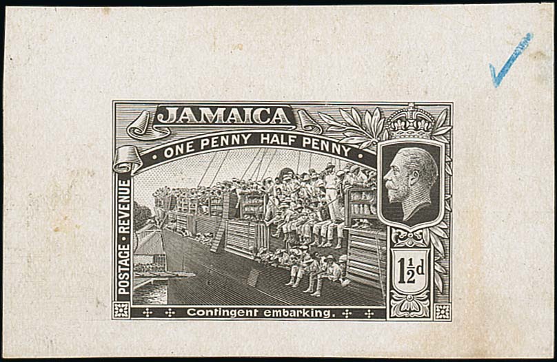 1919 Contingent 1½d., final stage die proof in black on glazed wove paper (67x43mm.), showing shading corrections to the King's head, blue crayon tick in upper right margin; fine. Photo