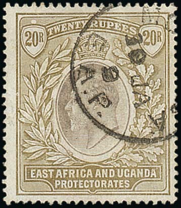 20r. grey and stone, cancelled by part Mombasa c.d.s. (Proud Type D7) for 30 January 1909, fine. S.G. 32, £1400. Photo