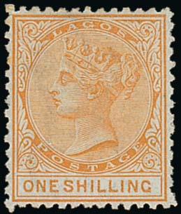 1874-75 CC, perf 12½ 1/- orange with value 15½mm. long, unused with part original gum, fine. S.G. 8, £700. Photo