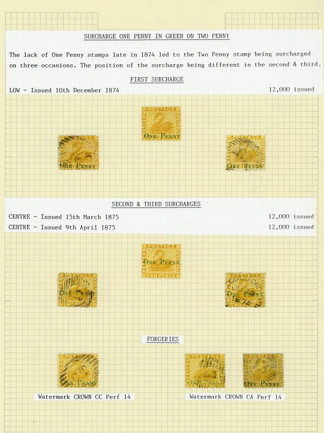 1874 (Dec.) "one penny" on 2d. yellow with surcharge low (3, one mint) and with surcharge at centre (3, one mint), also three forgeries; fine. S.G. 67, £1620