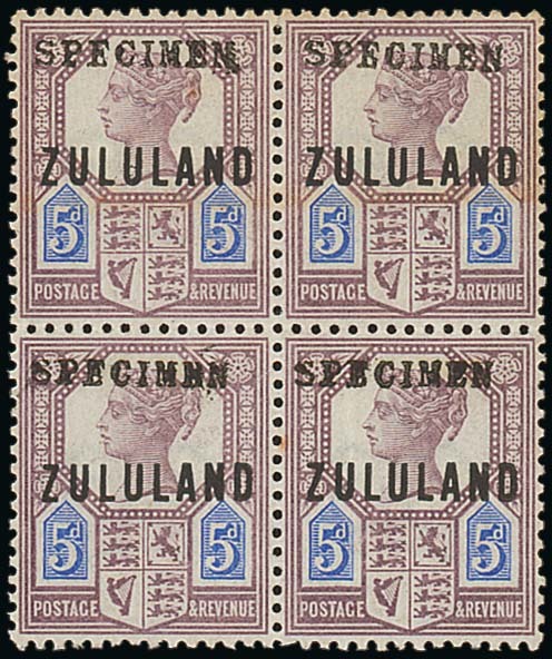 ½d. vertical pair, 2d. horizontal pair, 2½d. block of six (2x3), 4d. vertical marginal strip of three, 5d. block of four, 6d. block of six (2x3) and 1/- upper left corner vertical strip of four, each handstamped "specimen" (GB9) with the centre pair of the 2½d. block with the overprint below "zululand" as opposed above it as with all others in this group, good colours and with large part original gum; a few small faults in places though of fine appearance and a very rare group of multiples. Photo