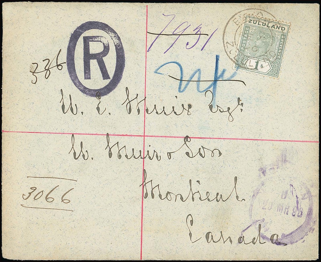 1896 (26 Feb.) envelope registered from Eshowe to Canada, bearing 1/- green neatly cancelled by double-ring datestamp, "R" in oval handstamp at left and London Registered datestamp (29.3) at foot, Durban and Montreal (11.4) c.d.s. on reverse. Photo