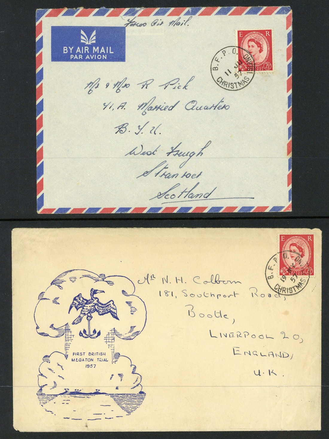 A Pacific Islands selection of covers (16) including British Solomon Islands Barakoma Airfield used on last day, Christmas Island 1957 atom bomb trial types (2, one illustrated), Gilbert and Ellice Islands envelope to Fiji showing rare "Launch Mail from/Territory protem./enemy-occupied/VIV" cachet and censor label, 1946 Peace sets used in Cook Islands (3) and Niue (3), and Tonga Tin Can mail