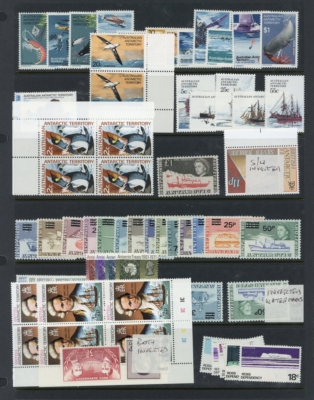 A small group of Antarctica, comprising A.A.T. (21), B.A.T. (38 with 1969 £1, 1971 set with additional 3p. on 3d. and 50p. on 10s. with inverted watermark), and Ross Dependency (8 with 1967 3c. and 15c. with inverted watermark), fine unmounted mint