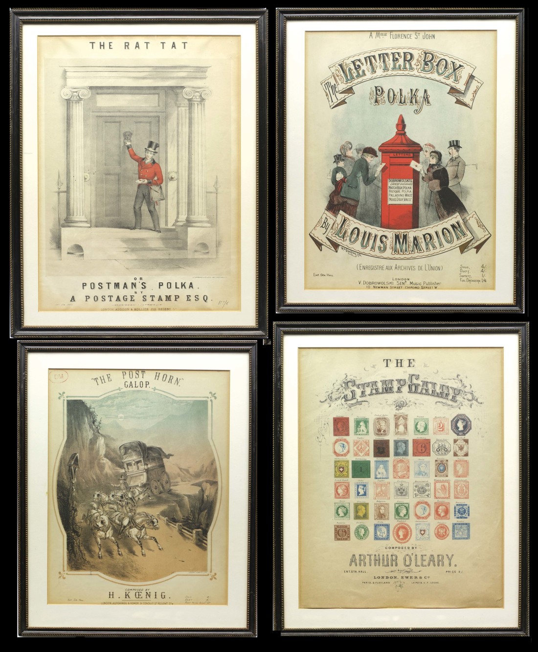1860 (c.) attractively framed, coloured prints (4, each 310x400mm.) with a Philatelic/Musical theme, comprising "The Letter Box Polka", by Louis Marion, "The Posthorn Galop" by H. Koenig, "The Rat Tat or Postman's Polka" by A Postage Stamp and "The Stamp Galop" by Arthur O'Leary; fine