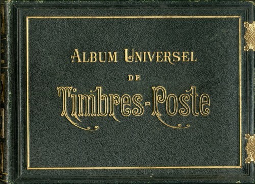 "Album Universel de Timbres-Poste" Volume 2 (c 1886), black leather bound with gold tooling on spine and front, two brass clasps, well used and containing many stamps (many later than the album) of little value, some pages with hinge remnants and pencil notes, some foxing; fine
