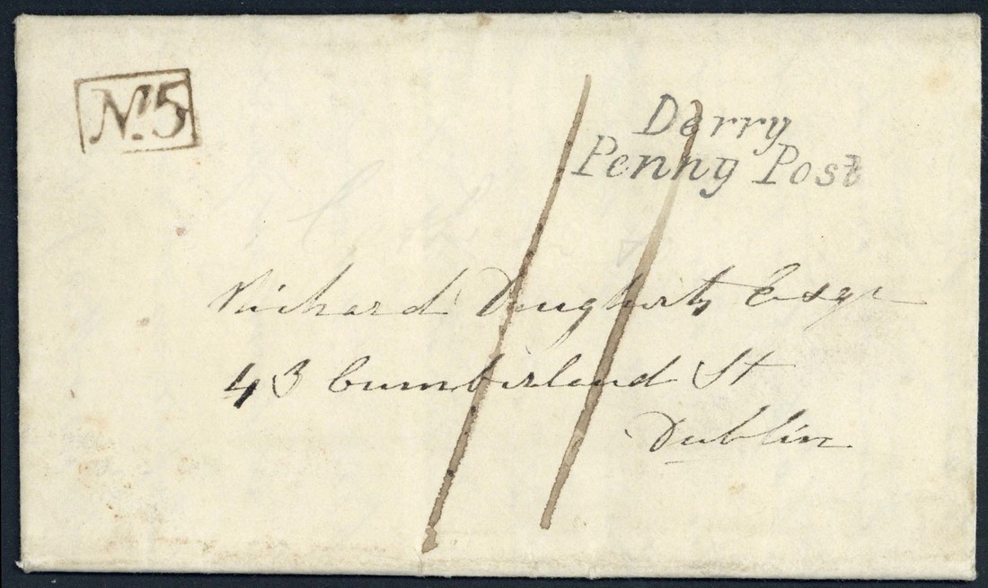 1836 (31 Jan.) entire letter to Dublin with superb "Derry/Penny Post" and framed "No. 5", dated markings on reverse; very fine