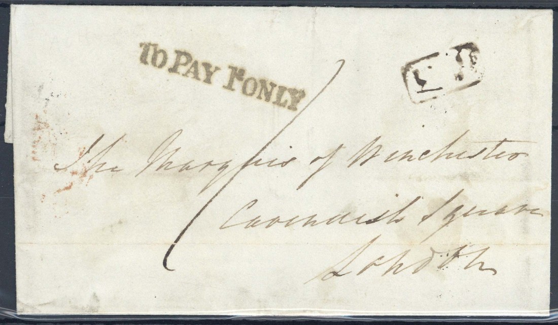 1838 (17 Feb.) entire to the Marquis of Winchester, London, with a superb strike of the unframed "to pay 1d. only" (1A/20), on reverse black "Alton/Penny Post" (across flap) and arrival datestamp; horizontal filing fold clear of the markings, fine