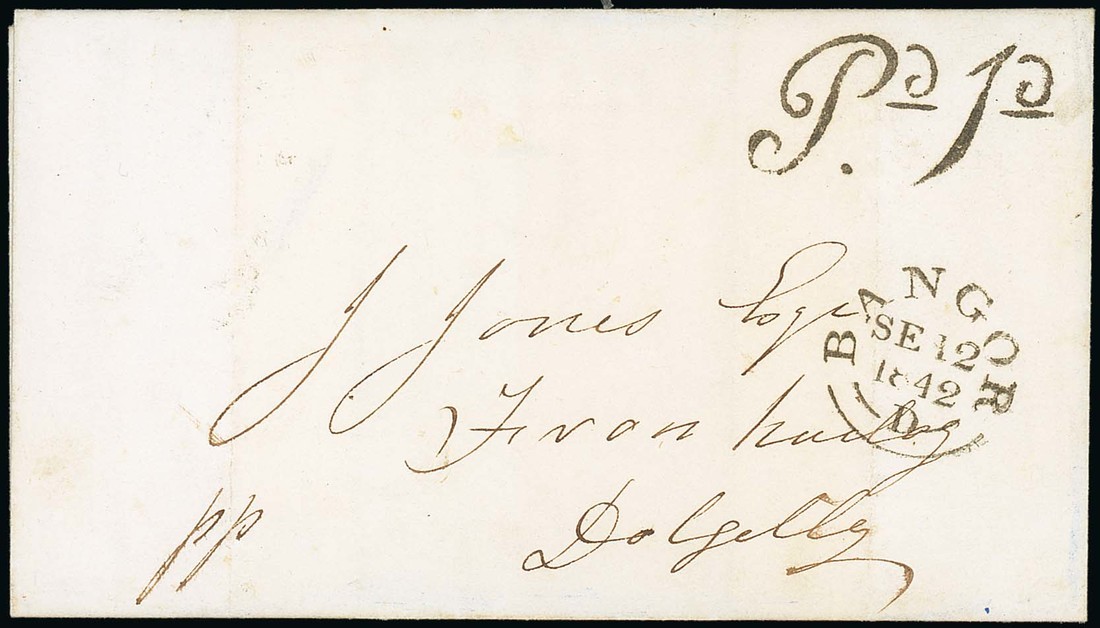 1842 (12 Sept.) entire endorsed "PP" with a wonderful "Pd. 1d." uniform penny post handstamp in black with Bangor c.d.s. below and Carnarvon arrival on reverse; a clean and unobtrusive vertical filing fold crosses the handstamp. Fine. A stunning exhibition piece and extremely rare in this colour. Photo