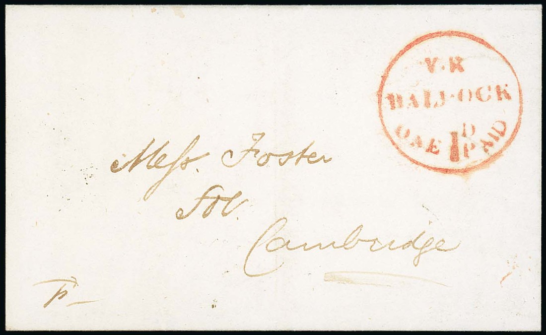 1843 (16 May) entire letter to Cambridge with a superb upright strike of the rare red Uniform Penny Post "v.r./baldock/one 1d paid" in circle, dated markings on reverse; clean central vertical filing fold. Believed to be the finest known example. Photo