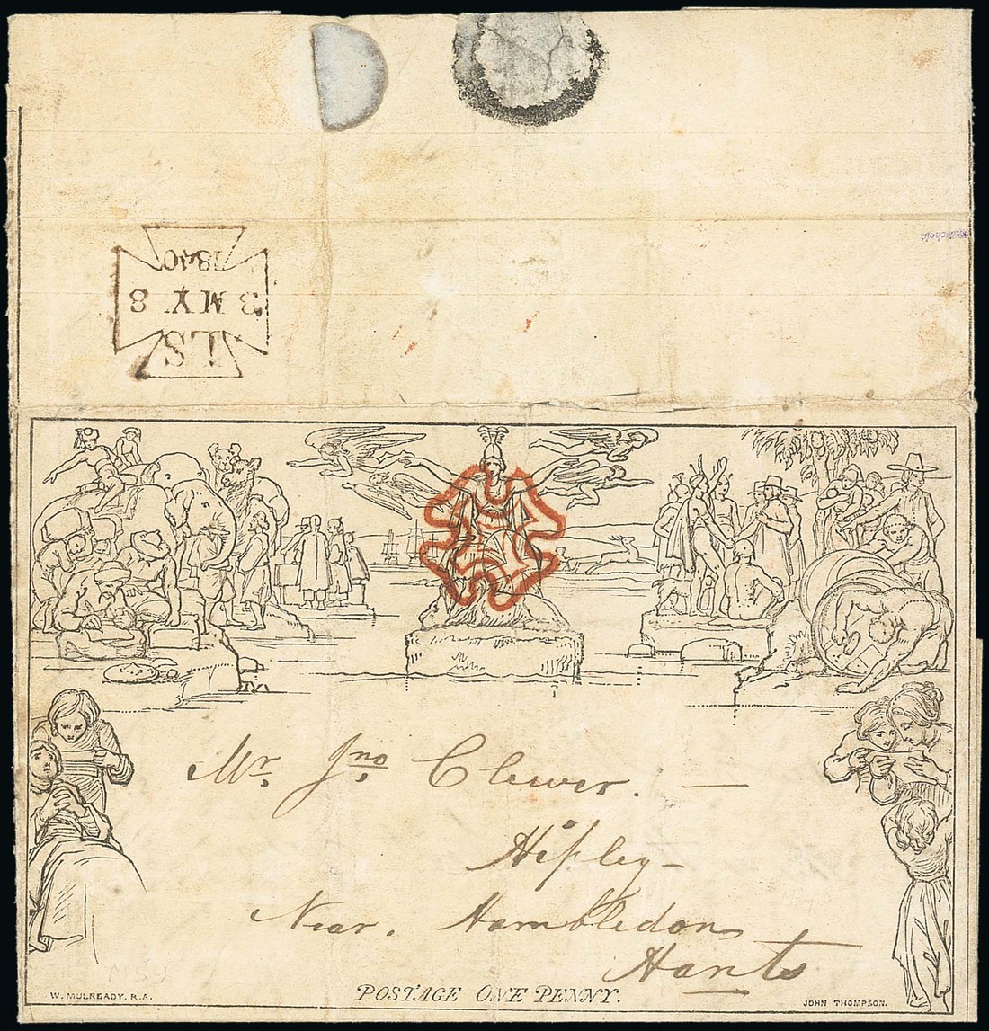 A3, dated 8 May 1840 (third official day of use), to Hipley near Hambledon, superb red Maltese Cross cancellation and on reverse equally fine Lombard Street Maltese Cross datestamp which opens well for display; creasing but fine and rare early use. Specialised £2,600. Photo