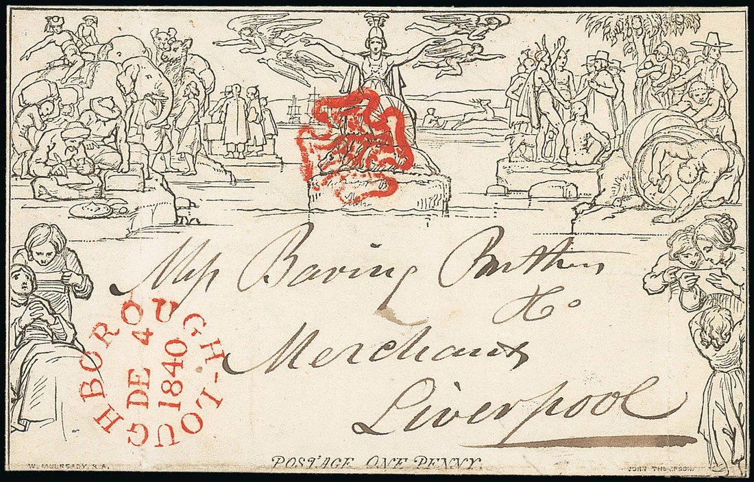 A8, dated 4 Dec. 1840, to Liverpool, bold central red Maltese Cross cancellation in a scarlet shade, superb matching Loughborough c.d.s. at lower left, "L" in lozenge arrival (5.12) on reverse; unobtrusive vertical filing folds (one through the datestamp), a piece of selvedge attached to the reverse. Highly appealing. Photo