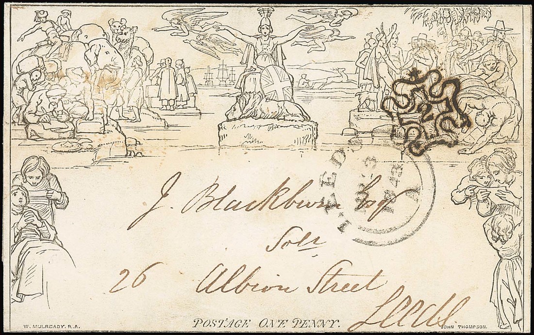 A54 dated 22 March 1843, to Leeds with a superb strike of the number "2" in Maltese Cross cancellation (to the right of Britannia, contrary to Post Office instructions) and with arrival datestamp on the front; very minor traces of toning, unobtrusive horizontal filing fold and the despatch datestamp on reverse has been inked in. Most appealing and rare. Specialised £3,000. Photo