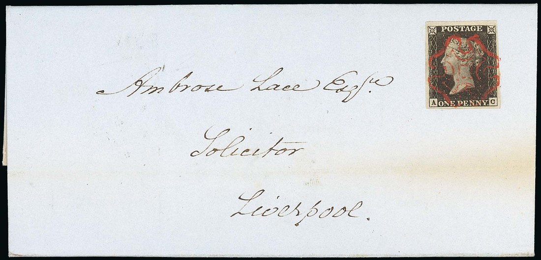 AC large margins all round, tied to entire letter by red Maltese Cross cancellation in a brick-red shade, dated 29 Oct. 1840, to Liverpool, on reverse Carnarvon c.d.s. and red "L" in lozenge transit mark; very faintly discoloured along a horizontal filing fold, well clear of the adhesive, fine. Photo.