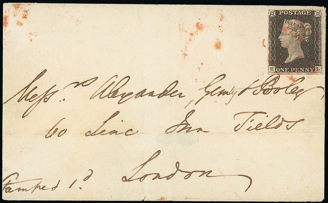 EL good to large margins all round, tied to large part lettersheet (no side flaps) to London by red Maltese Cross cancellation, on reverse Litchfield (?) c.d.s. of 31 May 1840 (Sunday) and arrival of 1 June; horizontal filing fold well clear of the adhesive, fine. R.P.S. Certificate (1984). Specialised AS15tk, £13,000. Photo