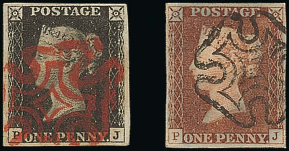 PJ good to large margins all round, crisp and upright red Maltese Cross cancellation; fine Matched by a four margined single with Greenock distinctive Maltese Cross cancellation. Photo