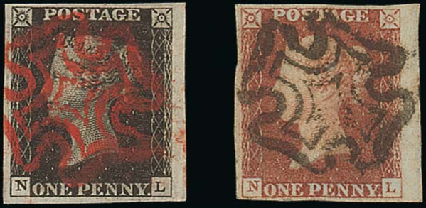 NL part of sheet margin at right and large margins other sides, crisp red Maltese Cross cancellation; fine. Matched by a four margined single in red with Dursley distinctive Maltese Cross cancellation. Photo