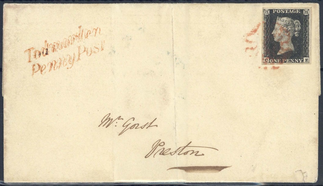 CE large to very large margins all round, tied by red Maltese Cross cancellation to entire, dated 9 Sept. 1840 to Preston, with red "Todmorden/Penny Post" alongside and blue Halifax d.s. on reverse; vertical filing fold well clear of the adhesive which has a small inclusion at left