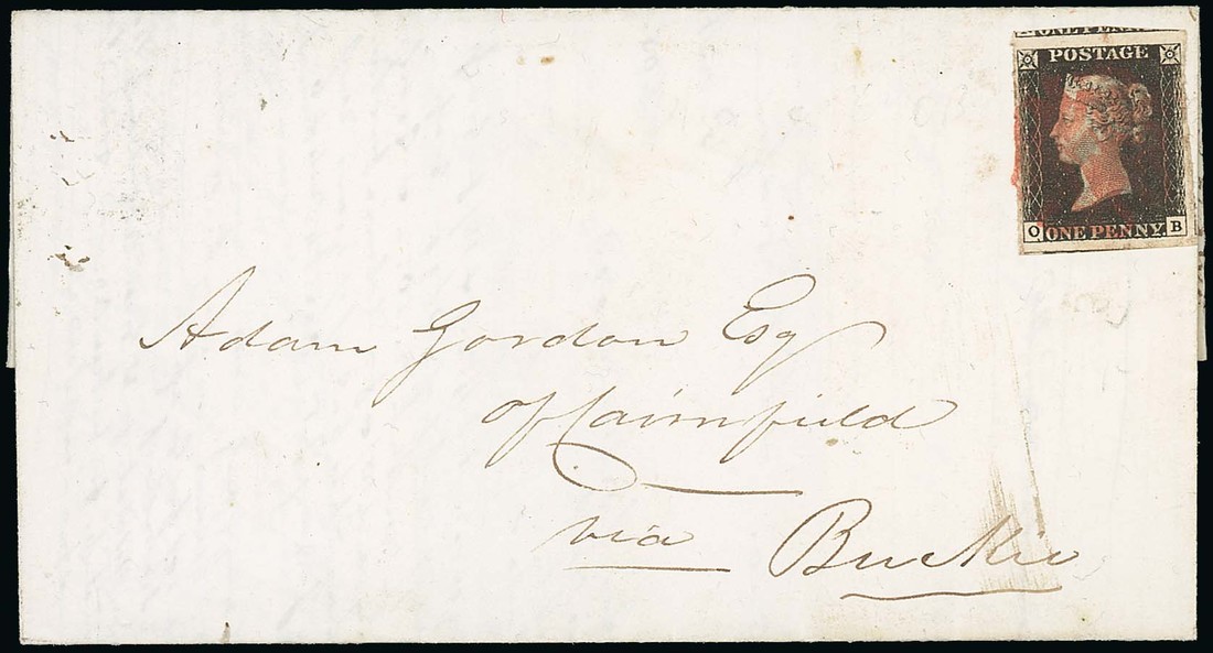 OB re-entry, large to very large margins all round and showing portions of three adjoining stamps, tied by slightly unclear ruby Maltese Cross cancellation, on entire letter, dated 22 Dec. 1840, to Buckie, boxed Aberdeen datestamp on reverse; clean and uncreased, fine. R.P.S. Certificate (1999). Specialised AS41ve, £4,500. Photo