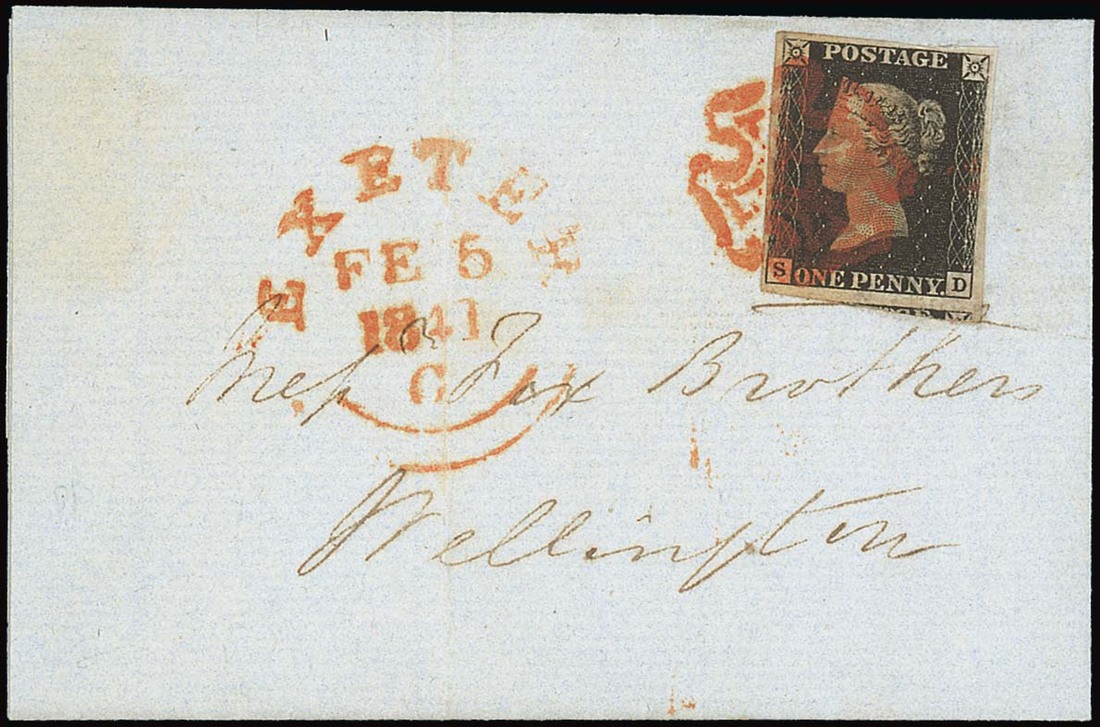 SD good to huge margins and showing a portion of the adjoining stamp at foot, tied by a fine red Maltese Cross cancellation to small, neat entire, with printed St. George Steam Packet Company's Office", dated 5 Feb. 1841, to Wellington with matching, upright Exeter c.d.s. in red alongside; fine. An outstanding entire from this scarce Plate. Photo