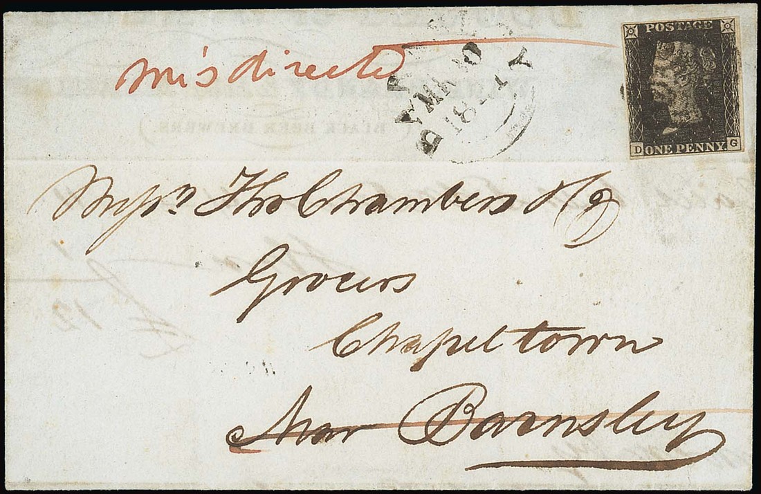 DJ close to large margins all round, tied by black Maltese Cross cancellation, on entire letter (decorated receipt from Rhodes & Sons) dated 30 March 1841, from Huddersfield to Chapeltown, endorsed "Misdirected" and with black Barnsley d.s. on the front, dated markings of Huddersfield and Sheffield on reverse; a fine cover from this rare Plate. With B.P.A. (1966) and R.P.S. (1997) certificates. Photo