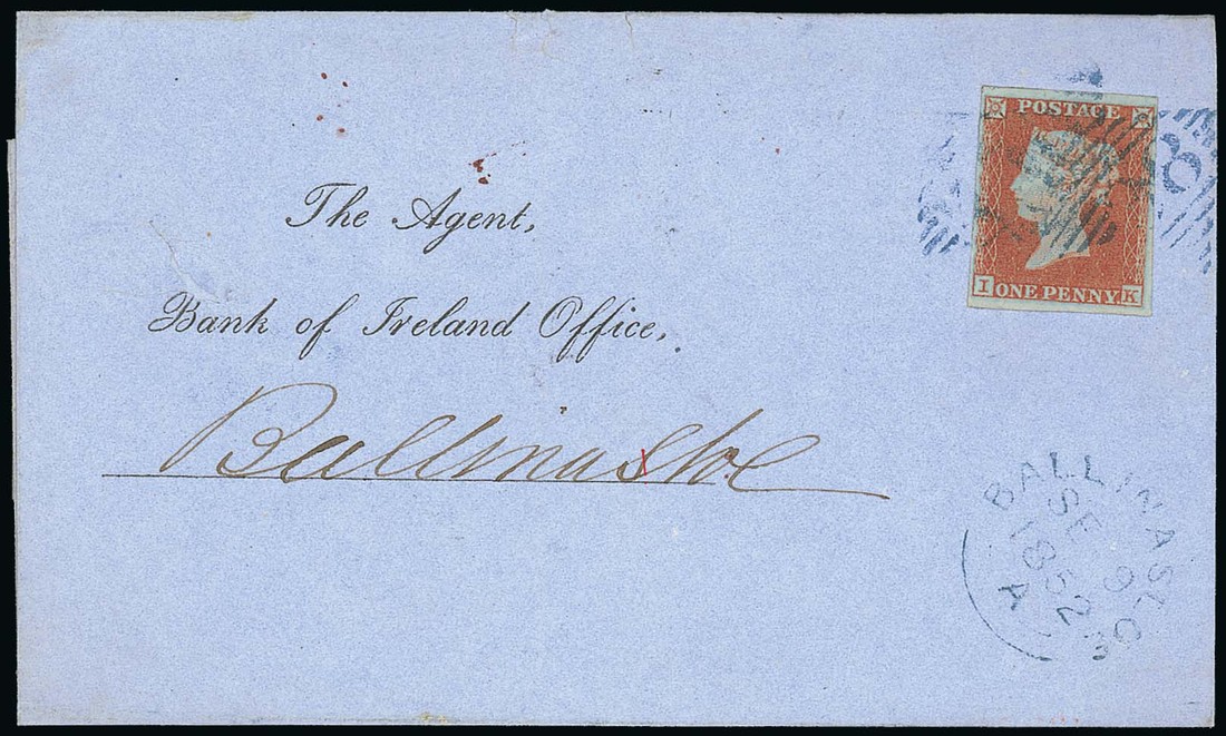 IA large to huge margins all round, tied to entire, dated 7 Sept. 1852, to Ballinasloe, blue "438" numeral cancellations of Tullamoore, dated markings on front and reverse; the envelope with some minor faults but of superb appearance. Specialised B1xb, £750. Photo