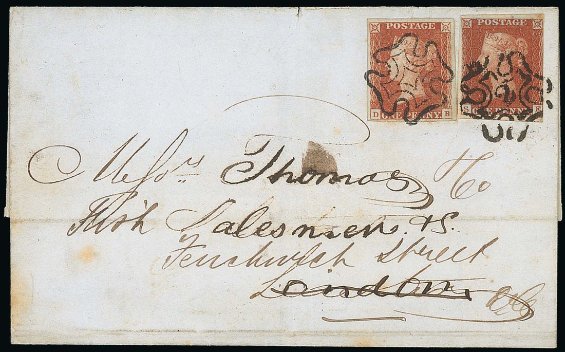 "2" tying Plate 39: SE (just touched at right) to local entire, dated 12 Dec. 1843, redirected to Fenchurch St. and additionally franked "Black" Plate 11: DB with large margins but creased; filing folds but very unusual. Photo