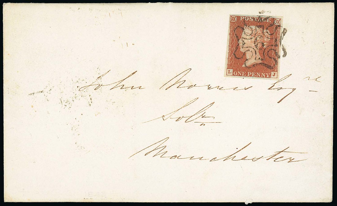 "6", a superb and upright strike, tying Plate 33: LJ, basal shift, large margins all round, to entire, dated 30 Aug. 1843, to Manchester; clean and uncreased. Fine. Specialised BS22uf, £450. Photo