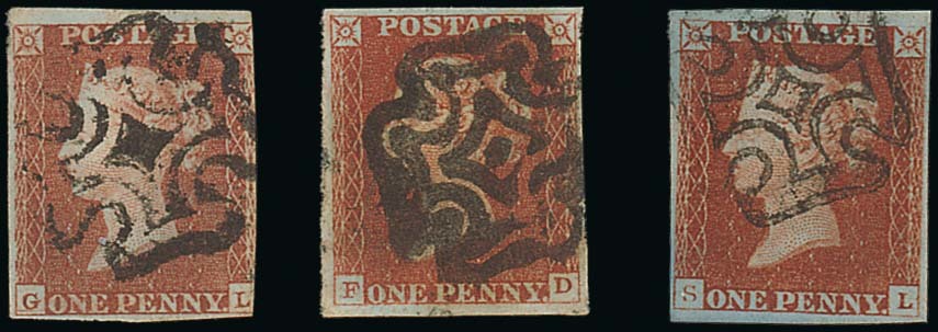 Selection (11), including Coventry (Plate 33: KJ), Norwich (Plate 27: PA), Kilmarnock (Plate 37: PD), Settle ("Black" Plate 8: GA on piece), Taiback (Plate 12: JC on entire to Cardiff), Tenby (Plate 12 TD, on piece), Welshpool, York (Plate 21: TA), etc., mostly four margined examples. Three with P.T.S. Certificates. Photo