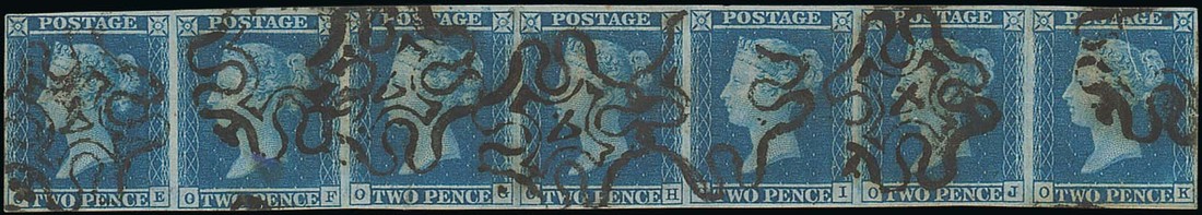 OE-OK horizontal strip of seven, OG re-entry, OE, OI and OK with guide line in corner, OF-OH guide line through value, OJ with "J" flaw, number "4" in Maltese Cross cancellations, margins all round; some small faults but a rare and impressive strip, R.P.S. Certificate (1993). Photo