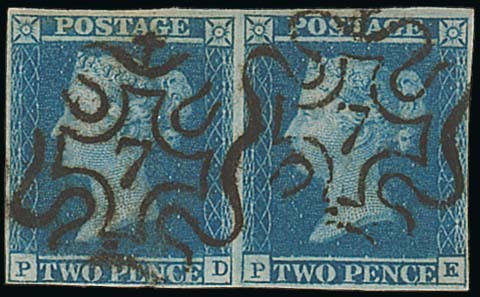 PD-PE horizontal pair PE shifted transfer, close to large margins all round, number "7" in Maltese Cross cancellations; PD corner crease, otherwise fine. R.P.S. Certificate (2008).