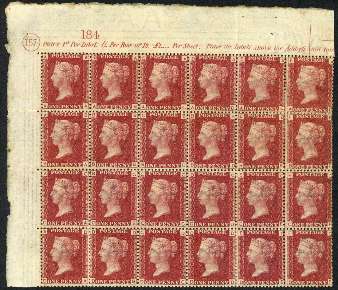 1d. rose-red, Plate 154: AA-DF, block of twenty-four from the upper left corner of the sheet with Plate number, mint or original gum, BF faulty, otherwise fine