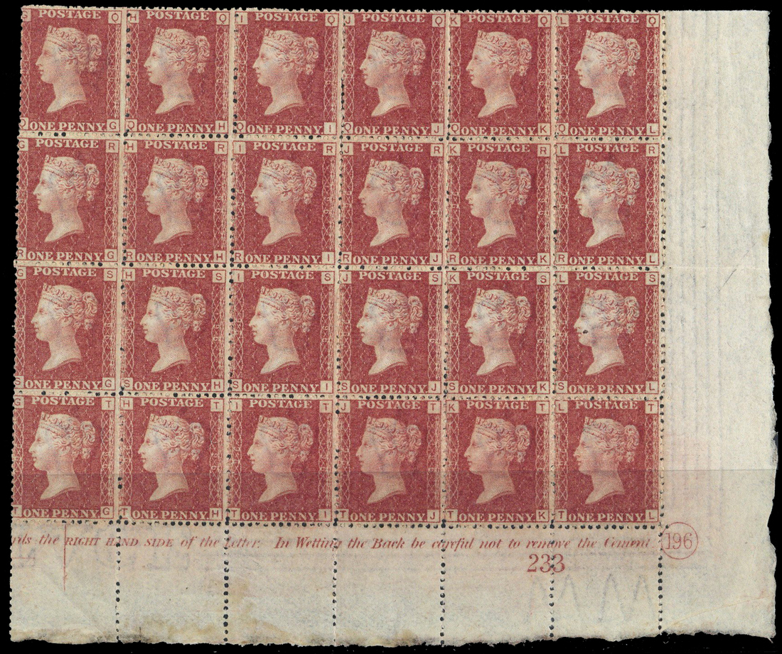 1d. rose-red, Plate 196: OG-TK, block of twenty-four from the lower right corner of the sheet with Plate number, mint, some gum creasing and a few split perfs., fine