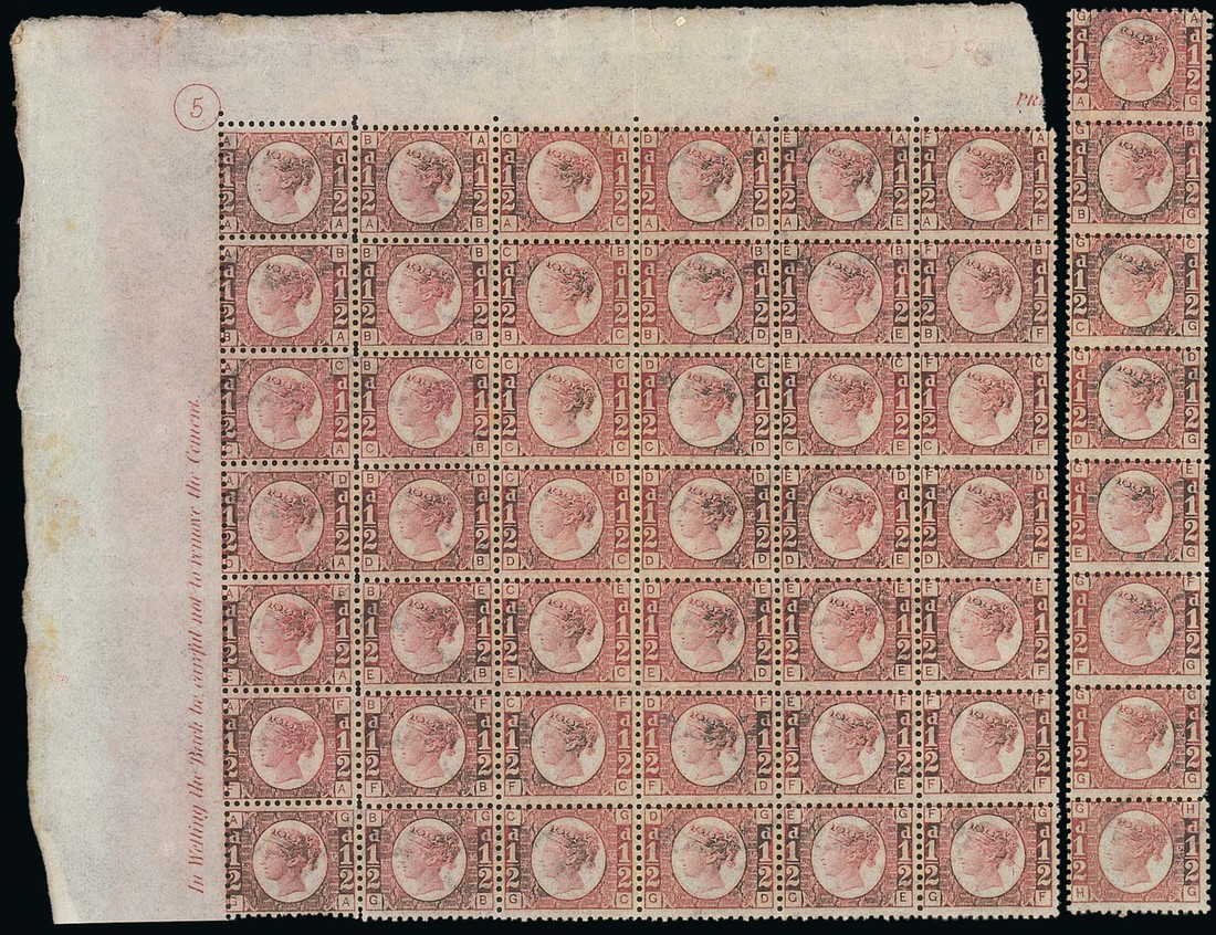 1870 ½d. Plate 5: AA-GF, top left corner marginal block of forty-two (6 x 7) showing Plate number 5 in circle and marginal inscription "In Wetting the Back be careful not to remove the Cement", plus the adjacent vertical strip of eight (separated) lettered AG-HG; some oxidisation, a couple of minor perforation faults and gum cracking as usual for this issue. Full original gum and a spectacular block. S.G. 48/49, £5,500+. Photo