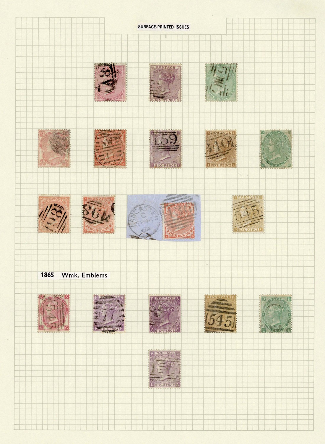 1855-1900 predominantly used surface printed collection (157) on pages, including 1855-57 1/-, 1862-64 9d. (2), 1/-, 1865-67 9d., 1/-, 1867 9d. and 2/- blue each with c.d.s., 1873-80 2½d. rosy-mauve Plate 17, watermark Spray 1/- orange-brown, watermark Garter 4d. vermilion, 4d. sage-green Plates 15 and 16, 4d. grey-brown, 1883-84 white paper 2/6d., 5/- and 10/-, 1883 or 1884 to 1/-, 1887-92 £1 green, 1900 1/-, etc., chiefly good to fine with many with c.d.s. cancellations