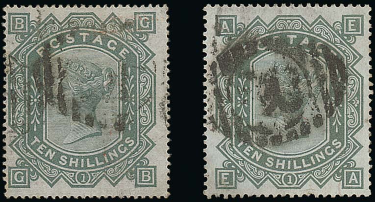10/- greenish grey GB, Watermark Anchor, white paper 10/- greenish grey EA, each with barred oval cancellations; sound. S.G. 128, 135, £7,700. Photo