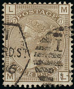 1873-80 Watermark Garter 4d. grey-brown, Plate 17: ML, watermark inverted, London geometric duplex cancellation; fine and scarce. S.G. 154Wi, £1,200. Photo
