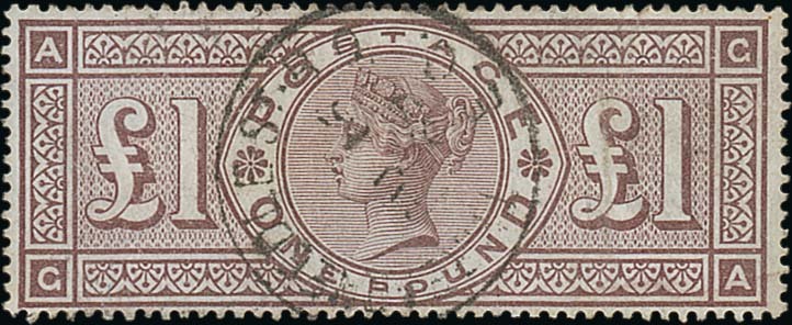 £1 brown-lilac, GA, light "threadneedle st./b.o./e.c." c.d.s; small rub at right otherwise fine. Good colour and appearance. S.G. 186, £4,250. Photo