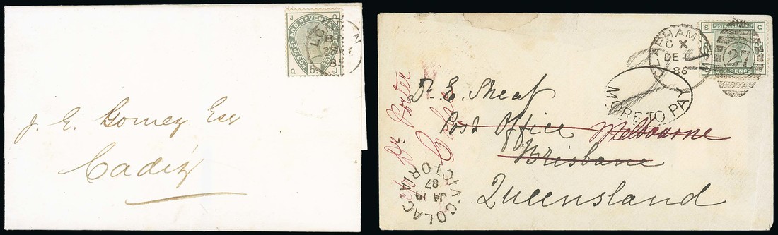 1883 or 1884 5d. dull green, tied by London c.d.s. of 28 May 1885 to entire to Cadiz; 6d. dull green tied by London "27" duplex to envelope, dated 1 Dec. 1886 to Queensland; the second a little soiled though scarce single frankings. S.G. 193, 194. Photo