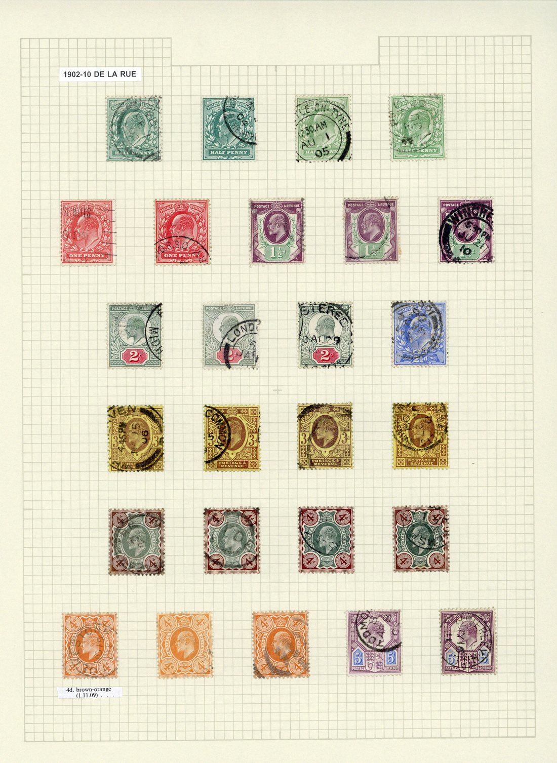 1902-13 predominantly used Collection (94) on pages, including 1902-10 De La Rue 4d. brown orange, 9d. (3), 10d. (4), 1/- (3), 2/6d.. (2), 5/-, 10/- and £1, 1911 Harrison perf. 15 x 14 ½d., 1911-13 Somerset House 9d. (4, two on pieces), 10d. (3), 1/- (3), 2/6d., 5/-, 10/- and £1, etc., chiefly fine and many with c.d.s.