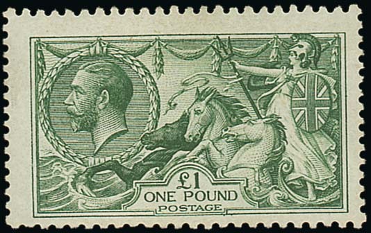 £1 green, unused with large part original gum; corner perforation bend, centred to foot. Fresh colour and fine. S.G. 403, £3,500. Photo