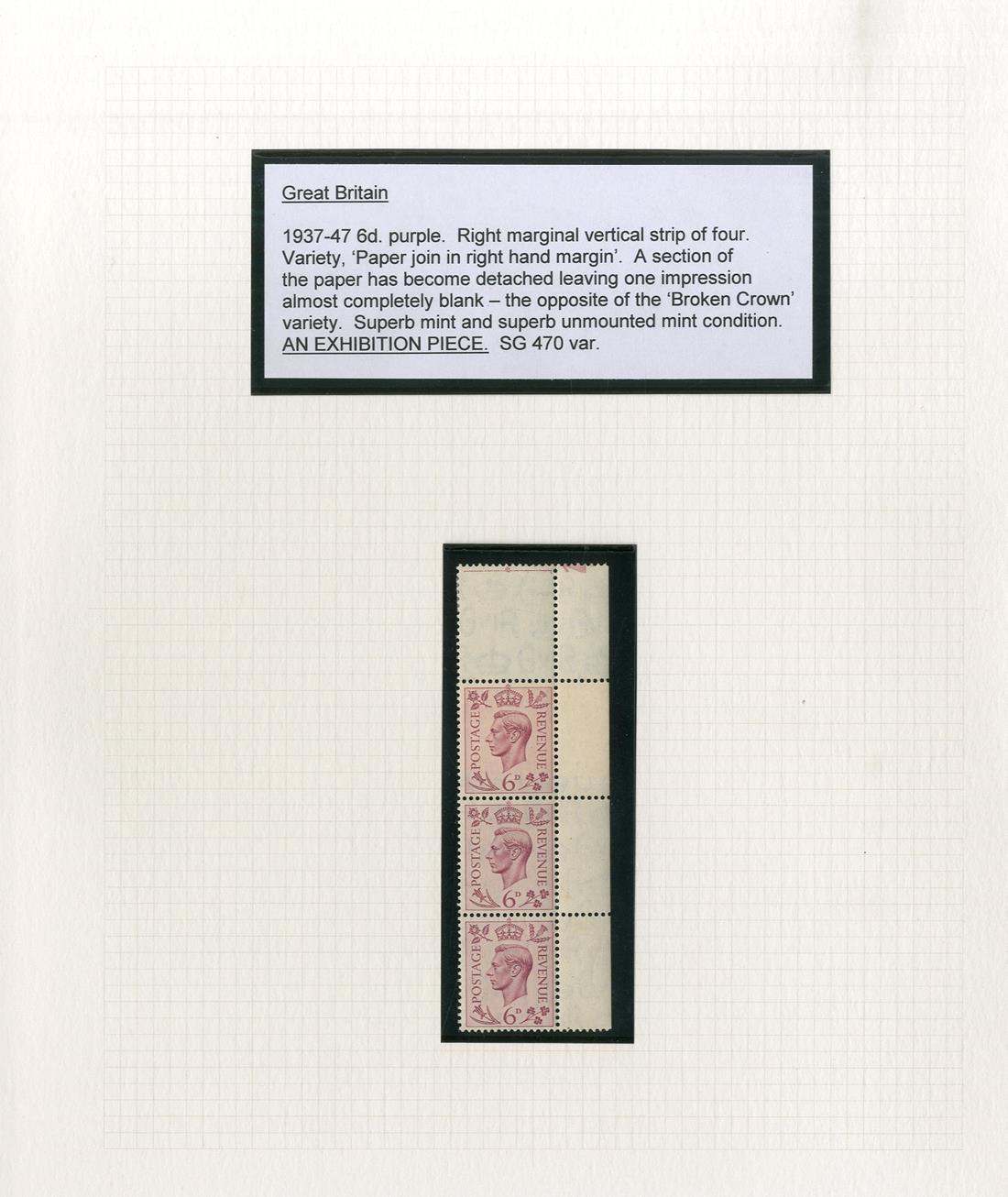 1937-47 6d. purple, marginal vertical strip of four with part "arrow", variety paper join on second stamp and margin and the top stamp almost completely blank. Also 1939-48 10/- dark blue pair (steel blue shade) and single (broken stem variety), 1951 1d. light ultramarine booklet pane of three with three labels (2), one the 17mm. first setting with watermark inverted, the other the 15m. setting with watermark upright and cylinder no. F7 when the adverts were applied by letterpress in a separate operation, unmounted mint; the latter with perfs. partially trimmed at right. KGVI Expertising Certificate (2006)