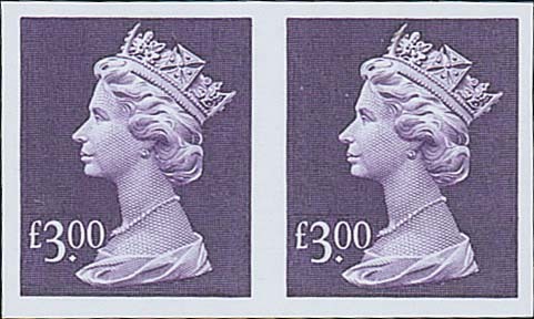 1999 Machin £3 dull violet horizontal pair, variety imperforate, unmounted mint. Very fine and exceptionally rare. S.G. Y1802 var. Photo