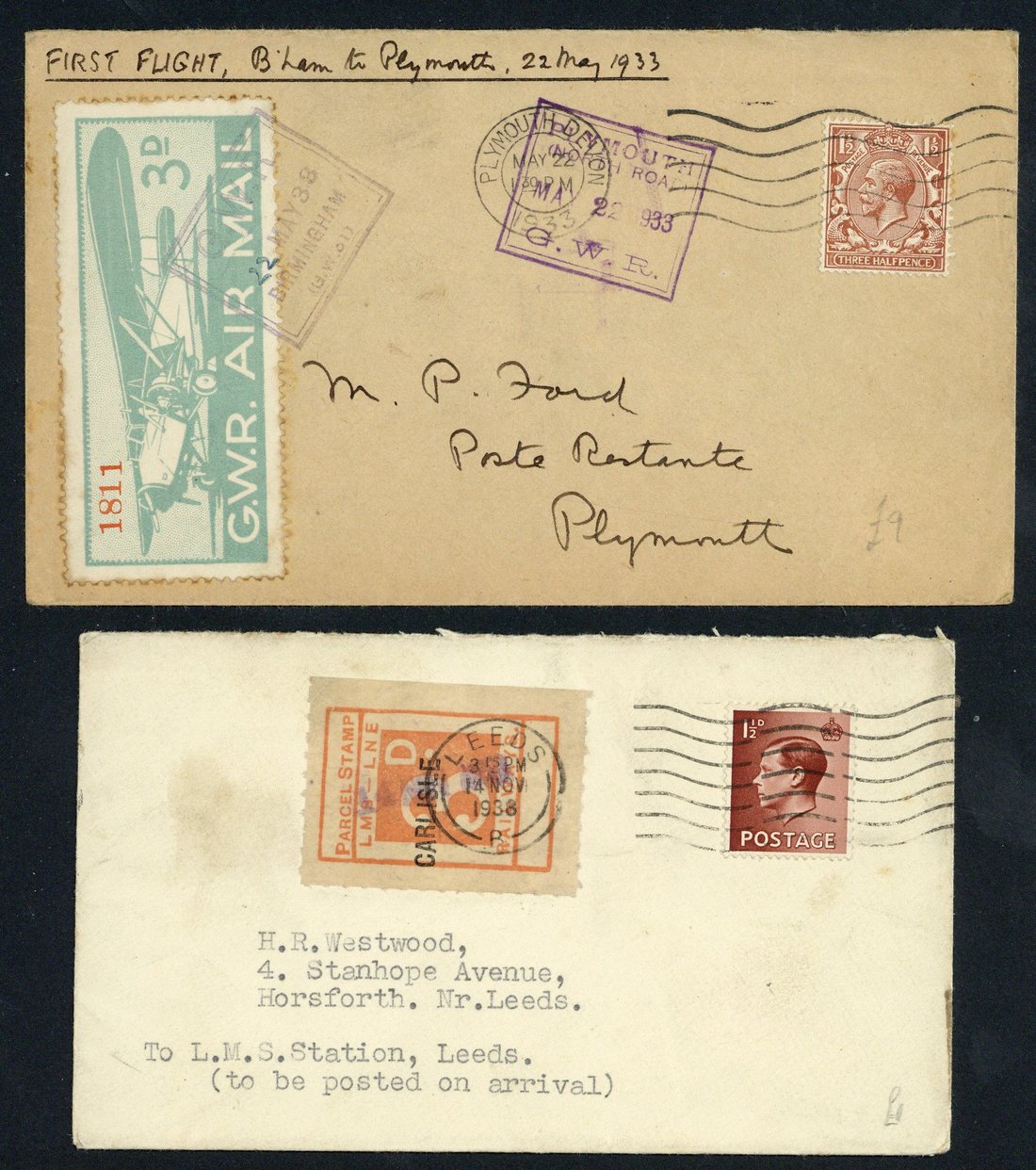 Large collection of Railway Newspaper, Parcel and Letter stamps in a carton, issues from the 1900's to 1970's, a vast array of types and train companies represented from G.W.R. to Isle of Wight Railway, hundreds of covers including 1933 G.W.R. airmail, 1938 KEVIII parcel stamp overprinted carlisle, attractive commercial covers (100's) franked with british railways newspaper stamps, parcel labels, bus stamps (!) and some obscure railway Ephemera (tickets etc.) A messy lot with some duplication but careful sorting sure to reward