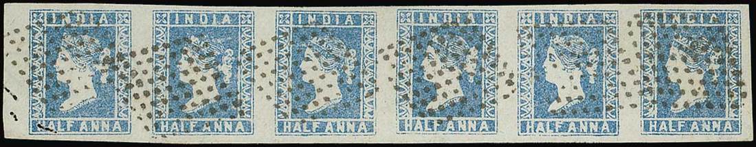 Pale blue strip of six, [9-14], each neatly cancelled with diamond of dots; [9] with defect, otherwise fine. Photo