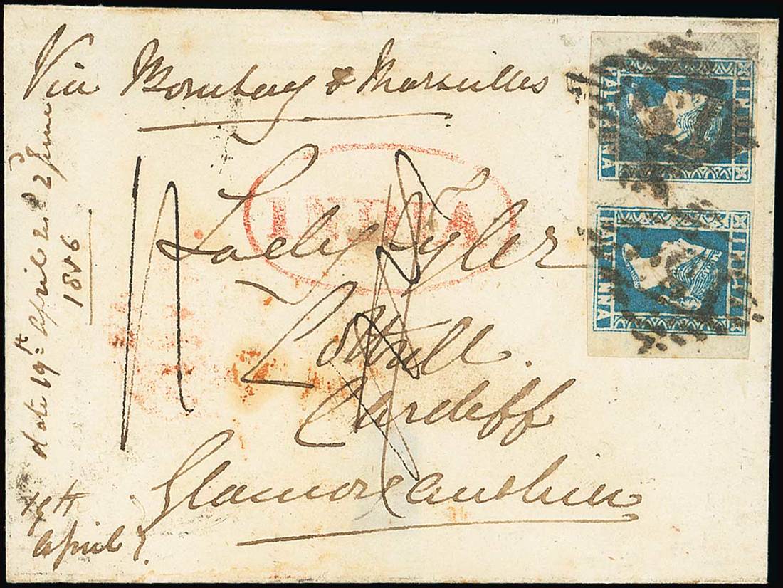 Greenish blue horizontal pair, [69-70], [70] showing retouched arches at left, both with indistinct Renouf Type cancellation and tied on 1856 (Apr.) entire from an army officer "Via Bombay & Marseilles" to his mother in England, variously rated and showing oval-framed "india" in red, four transit and arrival datestamps on reverse. An attractive franking emanating from the same correspondence as the famous first day cover franking offered in the "Rajah" sale of 1988. Photo