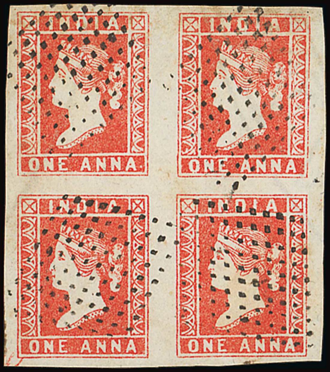 Red block of four, each neatly cancelled with diamond of dots; tiny traces of soiling at top, otherwise fine. Photo