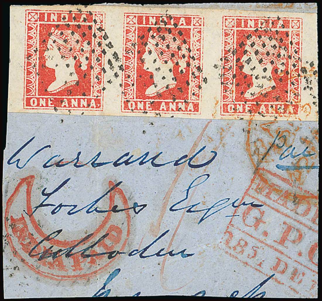 Deep red horizontal strip of three, each cancelled with diamond of dots and tied on piece to Colloden showing crescent-framed "india paid", large part Madras framed datestamp and London Paid c.d.s., the latter additionally tying the strip; fine. Photo