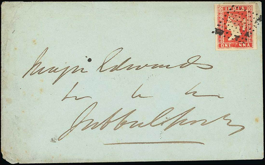 Deep red showing major printing flaw that has practically obliterated the first "a" of "anna", good to large margins, tied by diamond of dots on 1854 (10 Oct.) envelope from Kamptee to Major Edwards at Jubbulpore showing clear despatch "Paid" datestamp. Very fine and one of the earliest recorded usages of the One Anna. Photo