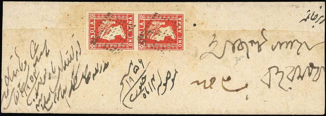Deep red vertical pair with good to large margins, both neatly cancelled by diamond of dots and tied (hinged in place) on reverse of native envelope showing "patna/p.o" datestamp (dates inverted) on face. Photo